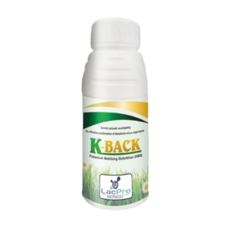K-BACK is a high-potency, water-soluble biofertilizer containing specialized Potassium Mobilizing Bacteria (KMB). While soil contains large reserves of potash, most of it is in an insoluble "fixed" form. K-BACK secretes organic acids that break down these complex minerals, making potash readily available for plant uptake.